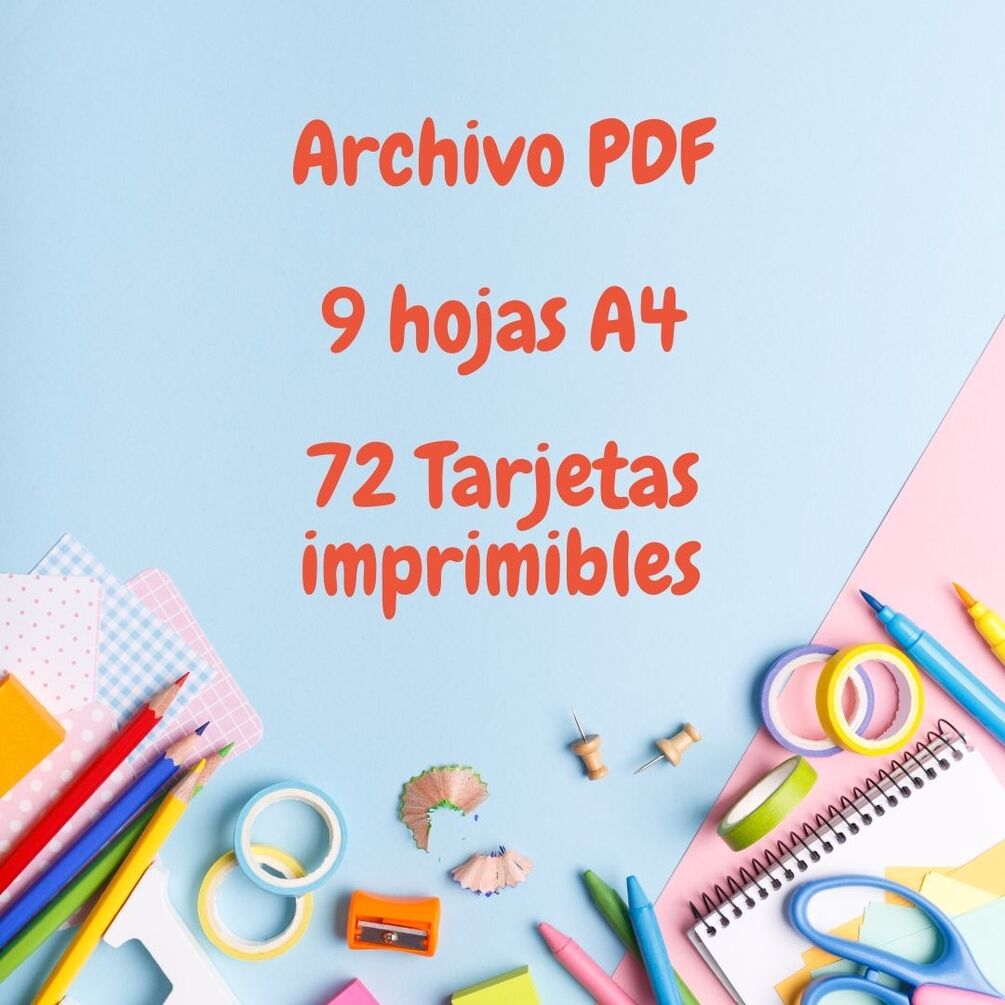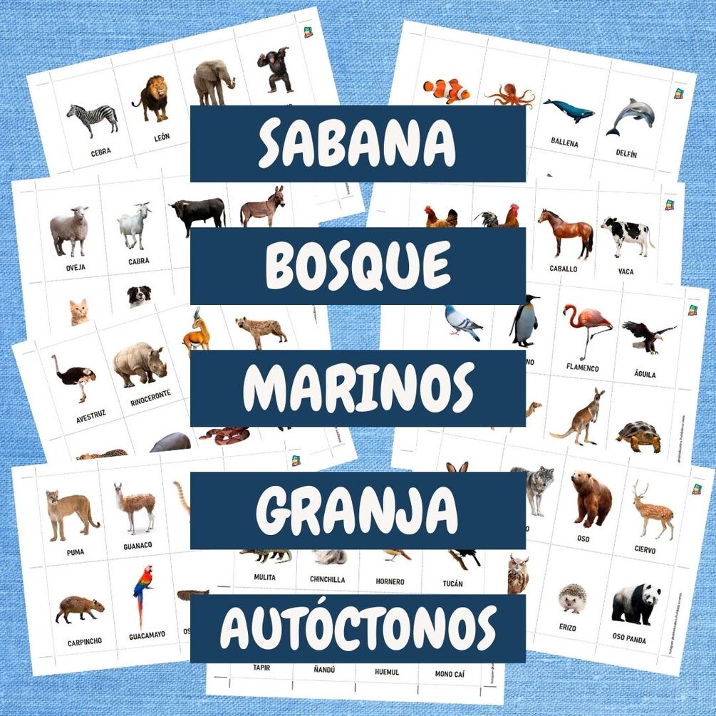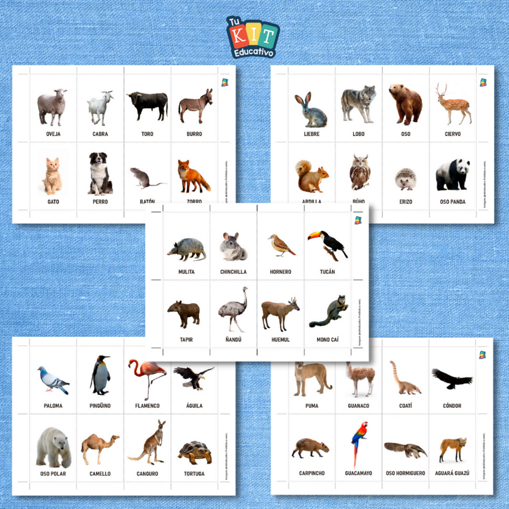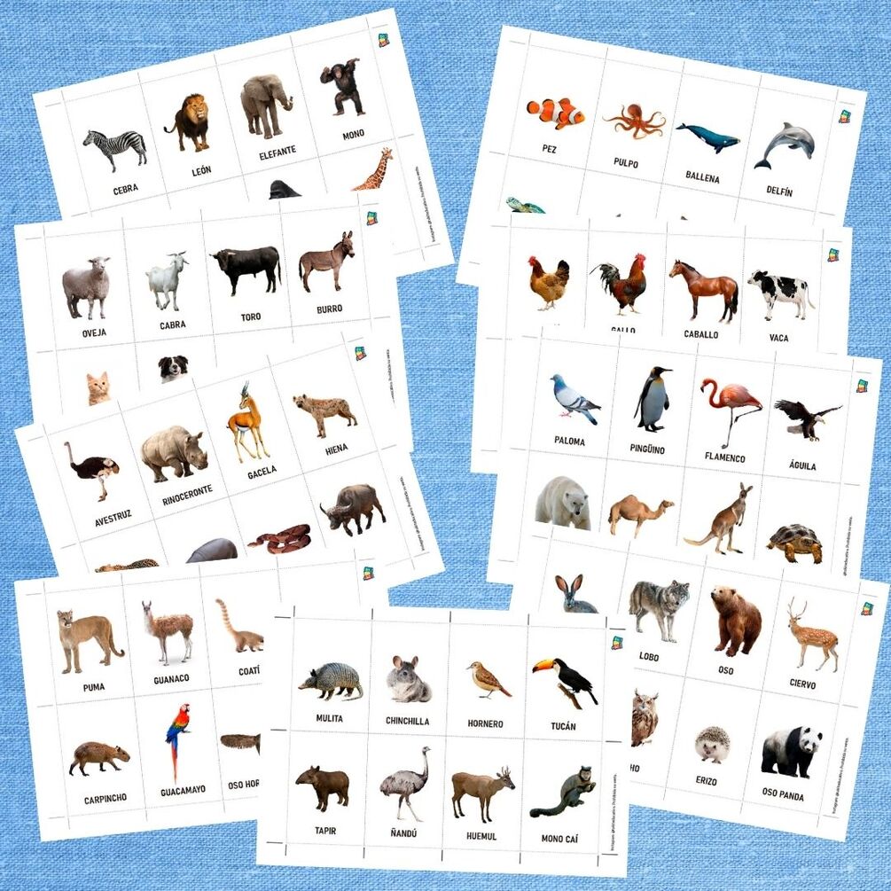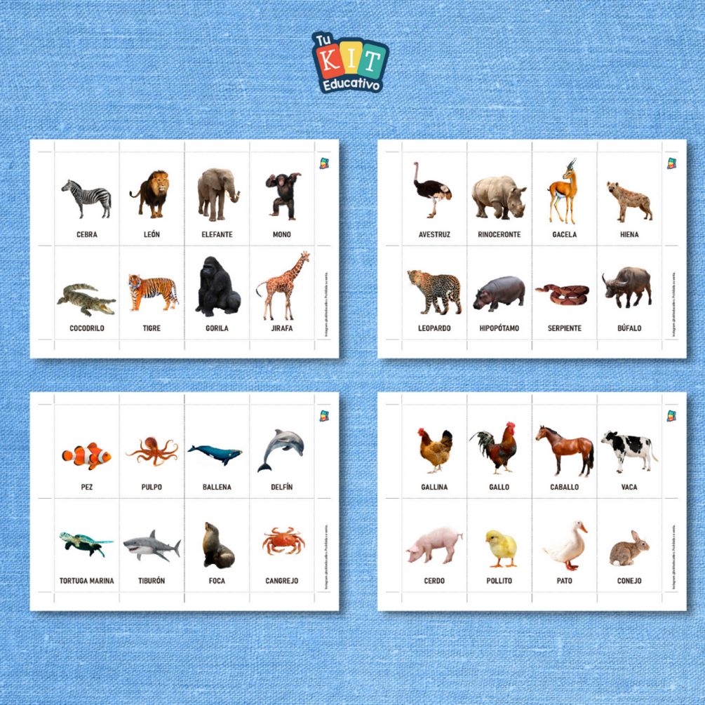 Este kit está compuesto por 72 tarjetas con imágenes reales de animales de 90x62 mm, distribuidos en 9 hojas tamaño A4 listas para imprimir, con fotos en alta resolución.